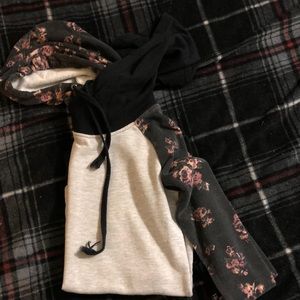 Two hoods. Floral sleeves and hood. Frayed strings. Slit sides. I can’t tell what size, but either a Small or a Medium.