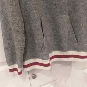 Classic Hoodie w/ exceptional softness. Red hood inner lining and red white stripe ribbing on sleeve & waist cuffs. There are no tags or sizing noted. Measures approx 25" pit to pit and 28.5" shoulder to hem. Sleeve length 26". I would consider this a unisex sweatshirt and approx men's medium/women's large.