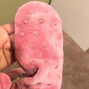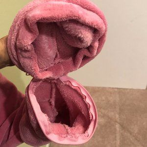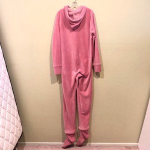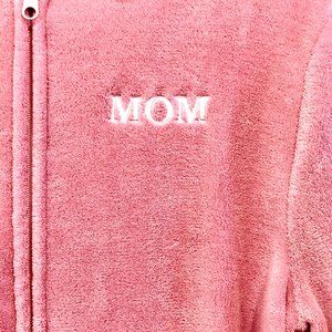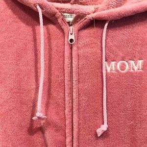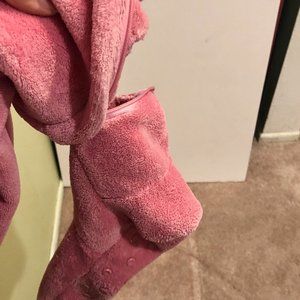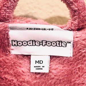 Hoodie-Footie - Pink "Monogrammed with MOM" - Size Medium. In plush, heavyweight microfleece designed to deliver head-to-toe warmth. Hood and kangaroo pocket. Zip-off feet with anti-skid soles. Long sleeves with thumbholes. Worn a few times and not cold enough in So. CA. Smudge on left foot front skid pads.