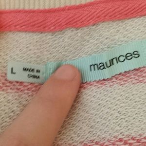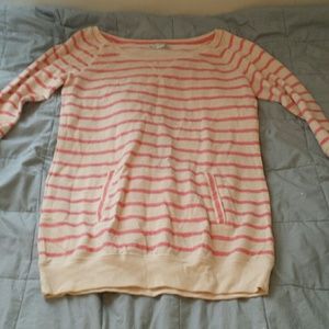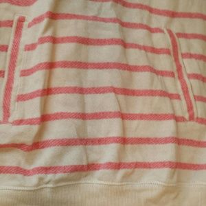Shirt is white with pink stripes. Has a kangaroo pocket. Sleeves look like 3/4 length.