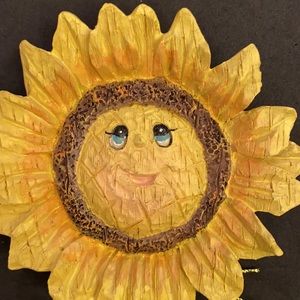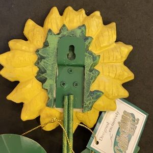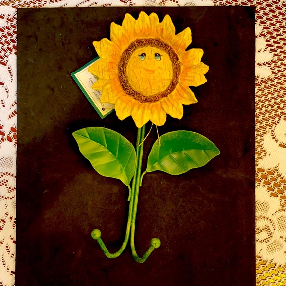 This is an adorable sunflower motif hook. Measures about 9 inches in length. And 5 1/2 inches across leaf-to-leaf. I have one in my washroom. For my shopping bags. Comes from a smoke and pet free home.