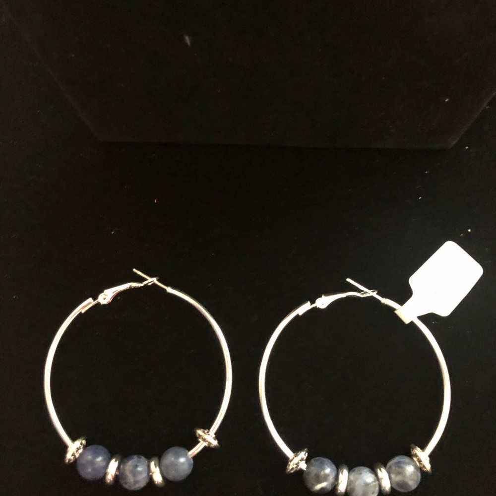 Silver plated, steel hoop, earring with antique, silver, spacers, and lapis beads.