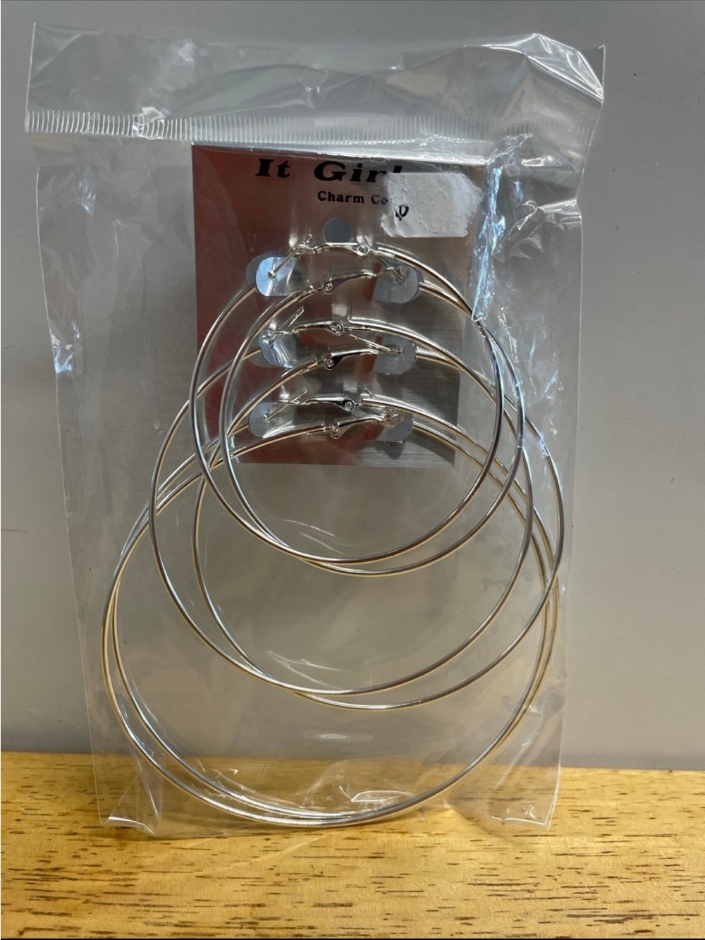 Set of silver-tone hoop earrings in multiple sizes. Lightweight metal with shiny finish. Simple and versatile design. Great for everyday wear.