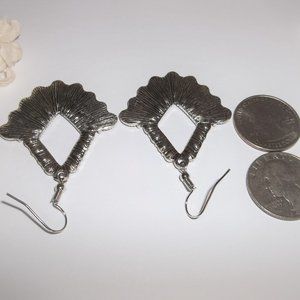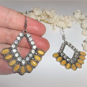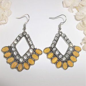 These pre-owned fancy hoop earrings are costume jewelry. They are a large statement size and antiqued silver toned. They have mustard yellow cat's eye oval cabochons. They also have sparkly faux white diamond rhinestones. Each hoop earring has nine oval shaped cabs. The pair dangle and drop from French fishhook ear wires for her pierced ears. Measure 2 1/4 inches tall and just over 1 1/2 inches wide. Each single earring weighs 8.8 grams. Make a statement wearing this attention-getting jewelry. Buy it now before someone else does!
