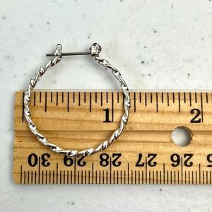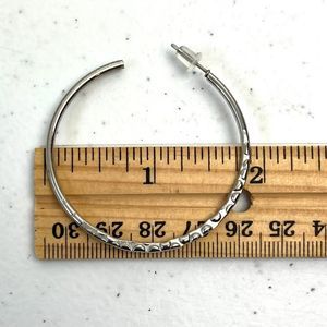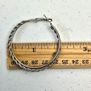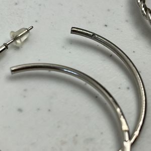 Three pairs of silver tone hoop earrings. Two of the pairs have never been worn. One pair is about 1.25 inches in diameter, and the other two pairs are about 2 inches in diameter. Two of the pairs have latch closures, and the other has silicone backers. One of the earrings has a slight manufacturing defect (depicted).
