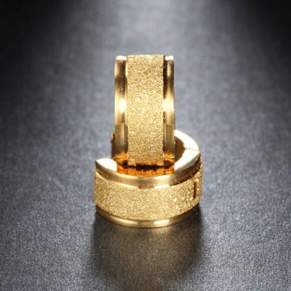 Brand new huggie style hoop earrings made out of yellow gold plated stainless steel with a shiny brushed finish. The earrings are 1/4" wide and their diameter width is 1/2". Their total weight is 6 grams.