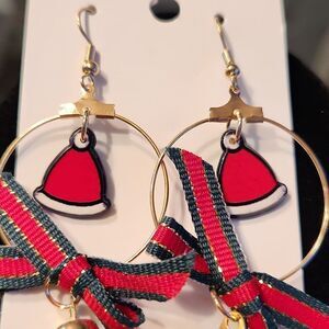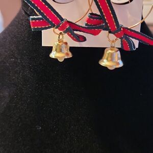 Beautiful Holiday Hoop Earrings with ribbon and bell charms. The length is 2.8”. The metal is Alloy.