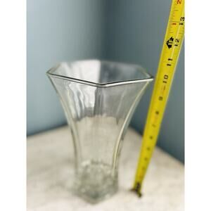 This is a large Hoosier Glass vase, standing 10 inches tall with a hexagonal shape and a clear color. It weighs 4 pounds and 10 ounces, making it a solid and heavy piece suitable for all occasions. The vase features an abstract art design and is ideal for displaying flowers or bouquets. Made in the United States, this original decorative piece is perfect for adults and requires hand washing for care.