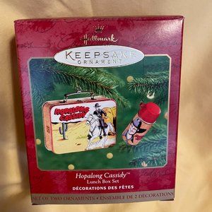 Hopalong Cassidy Lunch Box Set. This includes 2 ornaments - the lunch box and the thermos. They are approx. 3" high.