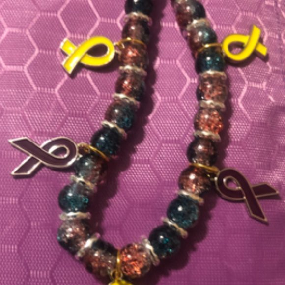 This is handmade for our foundation, Keith's Gift of Hope. All profits go to providing supplies and support for cancer patients. These are made with zinc alloy charms and 8mm glass beads. The purple charm is for caregivers. The charms can be customized to fit the cancer of choice. Choices are Breast, Sarcoma/Bone, Melanoma, Liver. More to come!