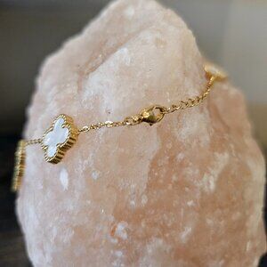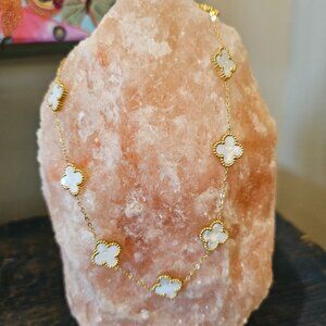 It is a classic clover design with 10 big sized clover spaced on gold tone chain