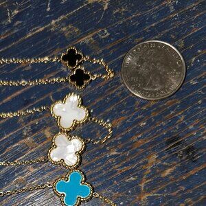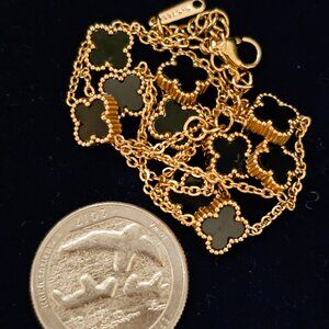 It is a classic clover design with 10 small sized clover spaced on gold tone chain