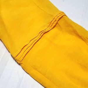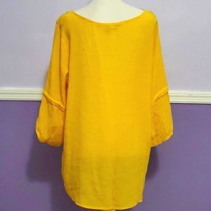 Yellow scoop neck swing flowy top with high low bottom hem. Lace on the shoulders to add a romantic view to your boho style. 3/4 semi valloon sleeves with lace trim and elasticized cuffs. Shell is 65% polyester and 35% rayon; trim is 100% cotton.