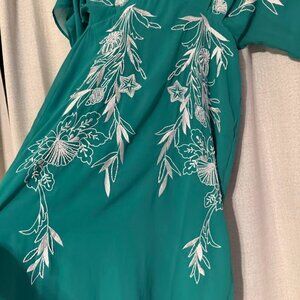 Stunning teal midi dress featuring intricate white and silver embroidered floral and starfish details.