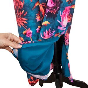 Hope and Ivy dress, floral midi dress, high neck dress, blouson sleeve dress, button waist dress, polyester dress, professional attire, teal dress, pink floral dress, size 10 dress, women’s fashion, elegant dress, midi length, bloomcore, preppy, feminine, blouson sleeve, puff sleeve, balloon sleeve