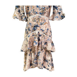 * Beautifully feminine details including flounce sleeves, lace banding at the waist and ruffled tiers, and blue watercolor-inspired floral print