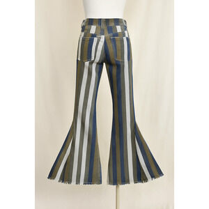 Turn heads in these Hope striped bell bottom jeans — a bold blend of retro and modern flair. Made from soft stretch denim, they feature vertical stripes in blue, olive, and cream for a flattering elongating effect.