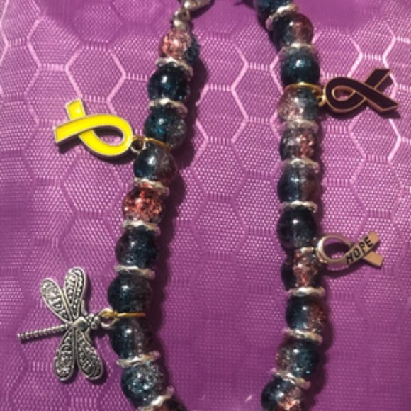 This is handmade for our foundation, Keith's Gift of Hope. All profits go to providing supplies and support for cancer patients. These are made with zinc alloy charms and 8mm glass beads. The color ribbons can be customized to fit cancer of your choice: breast, sarcoma/bone, melanoma, liver. More to come! The dragonfly represent someone in heaven watching over you. The purple ribbon is for caregivers.