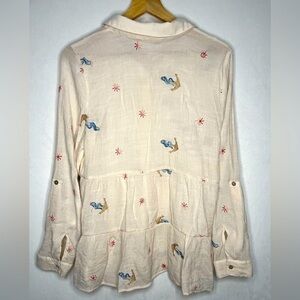 Cream blouse featuring colorful embroidery and seashell buttons. Button-up front with a relaxed tiered fit.