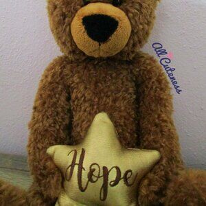 Cute brown sugar teddy bear plush holding a gold start with the word Hope embroidered.
