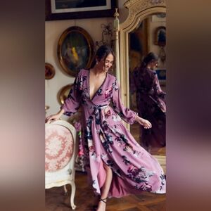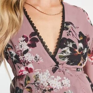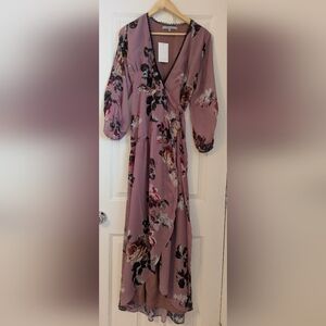 From online: Hope And Ivy The Minnie. A stunning Plunge Front Maxi Wrap Dress With Tie Front In Romantic Florals. Soft florals are strewn across a mauve base with black lace trim adorning the neckline. With a wrap front and tie waist, this flattering shape is completed by the full blouson sleeves. Perfect for your bridal party or a winner for any wedding guest.