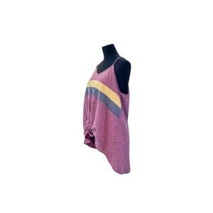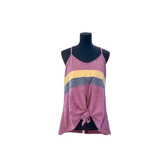 This Hopely color block tie-front tank blouse is a vibrant and stylish addition to any wardrobe! The bold horizontal stripes in red, yellow, and gray create a fun, eye-catching look, perfect for summer outings or casual days.
