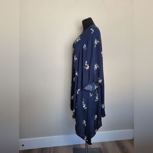 New without tags Floral Duster Kimono. Bell sleeves and assymetrical hemline. Open front. Beautiful Navy blue floral print. Lightweight breathable. Flattering and easy to grab and go for an added flair to any outfit. I have sizes small, medium and large available.
