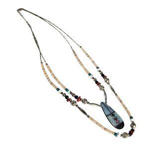 This exquisite Navajo Crown Dancer necklace features a double strand of turquoise, red jasper, and onyx chip beads, elegantly accented with sterling silver. Ideal for adding a unique touch to any outfit.