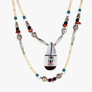 Hopi Crown Dancer Double Strand Necklace Turquoise Sterling Silver 26"
