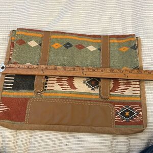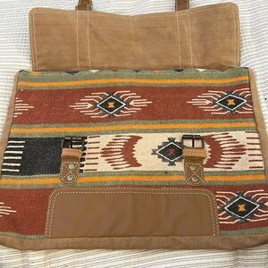 Computer bag with a vibrant pattern. Features earthy tones and geometric designs. Perfect for everyday use.