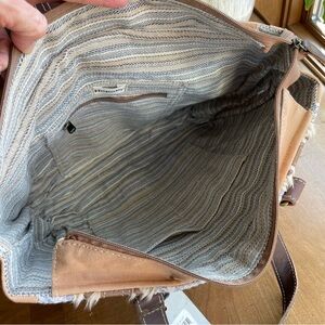 Stylish and versatile, this tote bag features a beautiful multicolor design. Pretty southwest design with muted natural colors. Canvas with fabric lining. Pony hair detail on the front. Zipper top closure with one exterior zipper pocket and an interior zipper pocket and two inside slip pockets. NWT