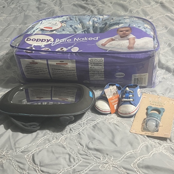 Boppy pillow bundle with car mirror, new baby shoes, new fresh food feeder, toys set . All items are in good condition
