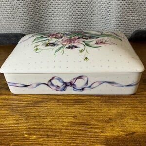 Horchow VTG Porcelain Floral Double Card Box & 2 Decks Original Playing Cards