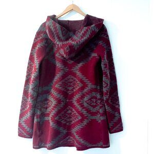 This beautiful long-length open cardigan sweater features a distinctive geometric diamond and Aztec-inspired pattern.