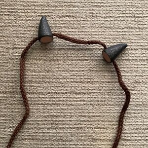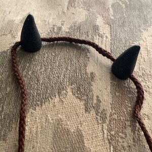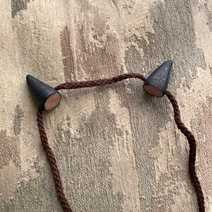 Tie these devilish horns on for a playful look! The horns are black with a hint of gold & silver sparkle and a brown string to securely tie them on! Perfect for a costume or Renaissance festival!