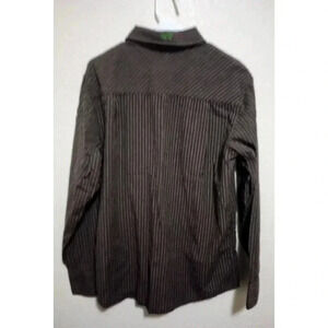 This Horny Toad button-up shirt is made of sustainable organic cotton in a stylish brown stripe design. The shirt features long sleeves, perfect for cooler weather, and is sized as a men's Large. The brand is known for their high-quality clothing and this shirt is no exception. The color is a rich brown that will match well with a variety of outfits.