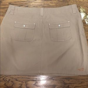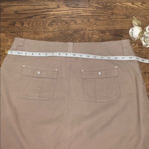 Hornet Toad Corduroy skirt. The color is camel. The closure is button and zip. There is decorative green fabric on the sides (as shown). There are two functional side pockets and two functional back pockets. Excellent condition. Measurements in pictures.