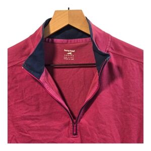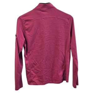 Horny Toad magenta quarter zip long sleeve pullover with navy blue accents and zipper pocket on arm. Website labels the colors as "Bright Plum/Deep Blue". Size Large.
