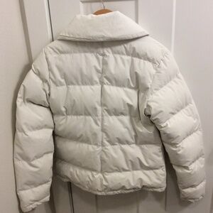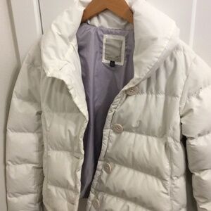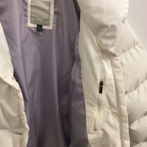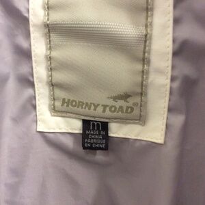 Great Condition! Horny Toad W's M white down jacket light purple lining - that BUTTONS up! Asymmetrical line for oversized buttons, 2 lined hand warmer pockets, & one internal zipper closure chest pocket. Simplicity & Warmth. Light discolorations on the back of the collar area pictured (I suspect hanger dust - other wise no snags or stains whatsoever. I will be tightening up one of the buttons prior to shipping (inside string visible in picture of internal zip pocket)... I'd rather deal with reattaching a button than replacing a zipper :)