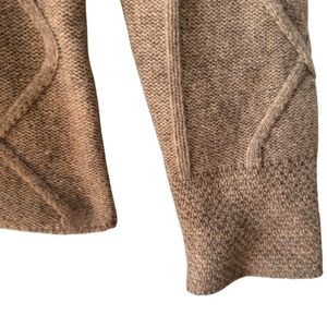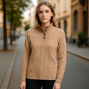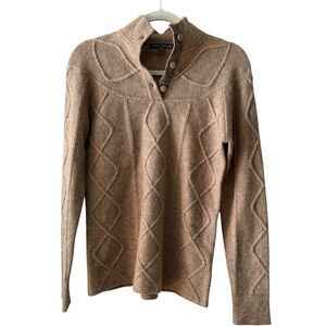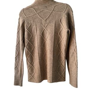 Authentic vintage Horny Toad wool-blend sweater in a warm, heathered tan. Features a raised diamond cable knit design, mock neck with decorative floral-trimmed placket, and unique carved buttons. Heavyweight and warm without bulk, perfect for layering in colder weather.