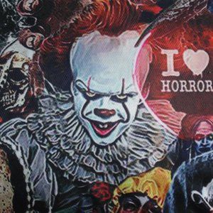 Collage style, with faces all over, from Freddy to Jason to Pennywise and even the hostess Elvira.