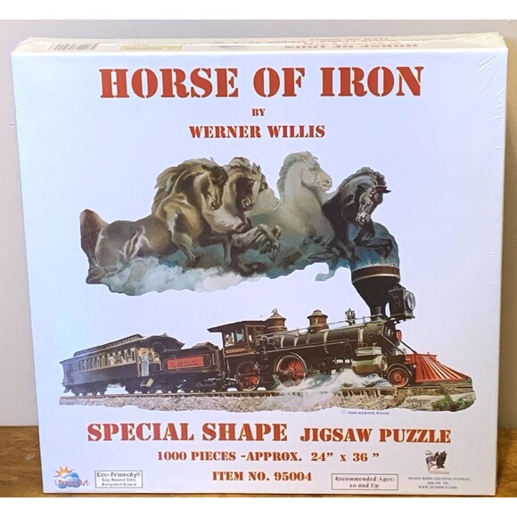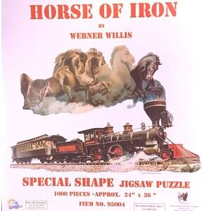 Horse Of Iron 1000 Piece Jigsaw Puzzle. Makes a great gift. Special Shape. Approximately 24" X 36". Horse of Iron is a nickname for a steam train. This puzzle features impressive artwork by Werner Willis. Depicts a majestic image of a steam train below galloping horses. Eco-friendly. Sealed.