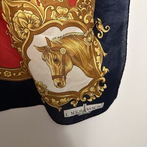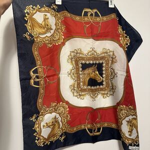 Horse Print Equestrian Scarf 30" x 30" Red Blue Gold Thin Lightweight Ornate