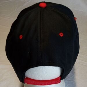 Black and red cap with horse racing embroidery. Features a dynamic design.