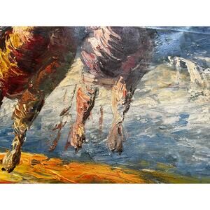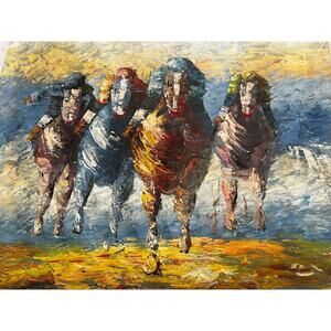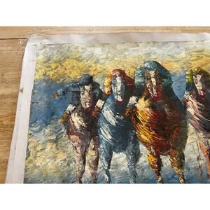 This is a vintage oil painting on canvas depicting a horse racing scene. The painting is signed by the artist, Davis, and is done in an impressionistic style. It captures the energy and excitement of the race. The artwork is in good vintage condition and would be a great addition to any art collection or a unique decor piece for your home or office. This is a great opportunity to own a unique and beautiful piece of art! Do not miss your chance to own it!