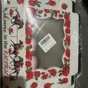 Decorative picture frame featuring a horse racing theme. Adorned with vibrant red roses and horse illustrations. Perfect for racing enthusiasts. Kentucky derby themed gift boxes set of 24 #191