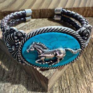 Horse Turquoise Stone Western Leather Open Bangle Bracelet