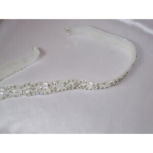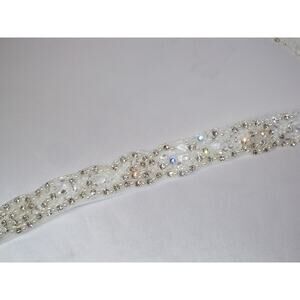 Rhinestone and bead horsehair skinny bridal belt. a beautiful stiff belt that hold it shape all night long. It is 1 inch wide. and has plastic snaps and hook and eye closure.