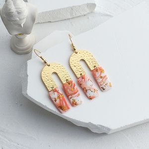 Horseshoe Gold Foil Flecked Polymer Clay Drop Pink and Gold Earrings