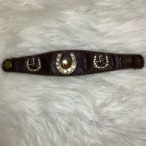 Cute brown leather horseshoe bracelet with gold colored jewels and distressed gold hardware. Gold beading on edges of bracelet. One big front horseshoe and two smaller horseshoe with cowgirl boots inside. Two snap adjustable closure. Approximate measurements: 9.5” long and 1.75” at widest part. In excellent worn condition. No missing jewels or beads.